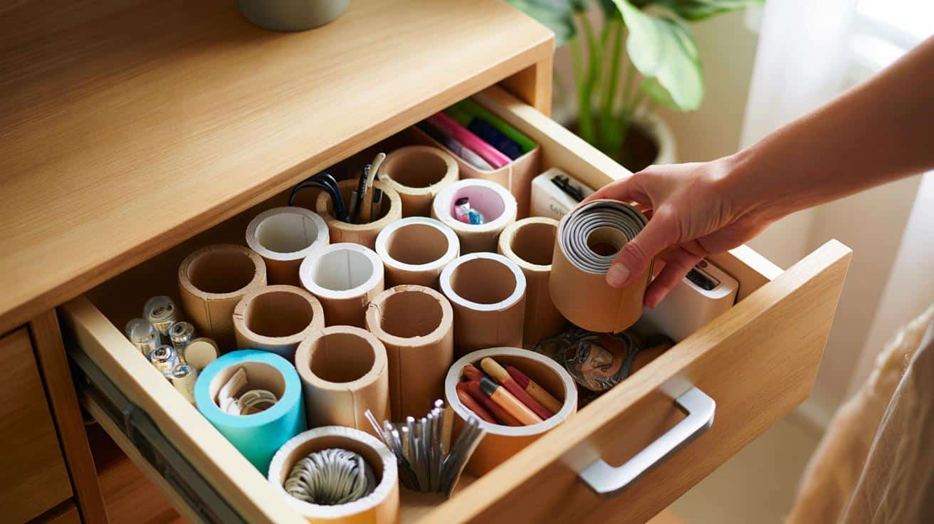 Primo gesto: raccogli 8–10 rotoli vuoti. Appiattiscili con le dita e tagliali in altezza se il cassetto è basso. Crea una “fila” orizzontale e fermala con un elastico o con due punti di colla a caldo agli estremi. Inseriscili nel cassetto e riempili per famiglie: cavi USB insieme, penne da un lato, rossetti dall’altro. Se vuoi un tocco pulito, rivesti il bordo con washi tape. È un piccolo gesto che cambia la giornata.
